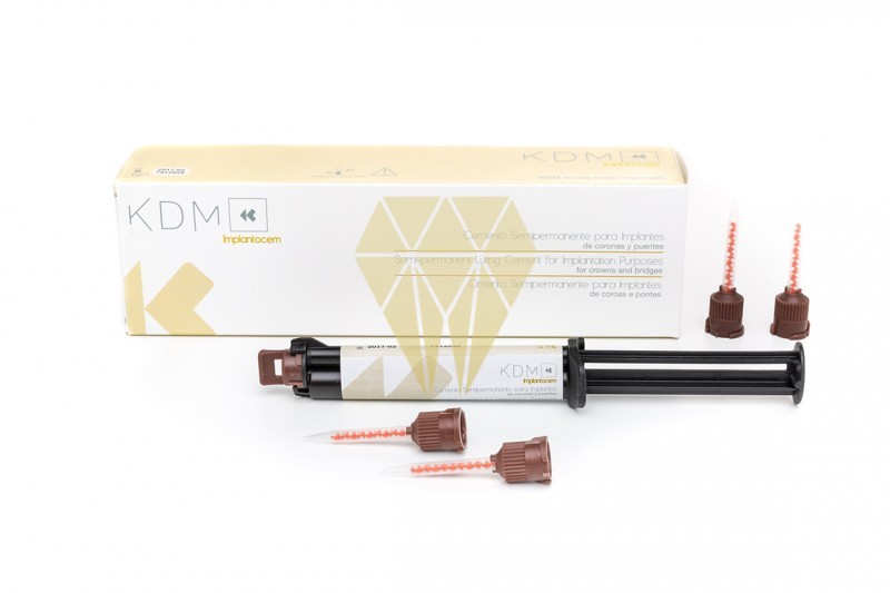 KDM IMPLANTOCEM CEMENTO SEMI-PERMANENTE PARA IMPLANTES. KDM IMPLANTOCEM ES APTOPARA CEMENTAR DE FORMA SEMIPERMANENTE LAS CORONAS Y PUENTES AL MUÑON DEL IMPLANTE. MUESTRA BUENA ELASTICIDAD Y UN BUENSELLADO GRACIAS A LA LIGERA EXPANSIÓN CONTROLADA. KDM IMPLANTOCEM SE SUMINISTRA EN JERINGAS 4:1 MINIMIX