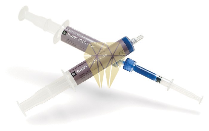 Super Etch con ácido fosfórico al 37% es un agente grabador específico para esmalte y dentina. Super Etch es un gel fácilmente controlable que fluye según la dirección de la aplicación, no por la gravedad.2 Jeringas Jumbo Super Etch de 25mL.