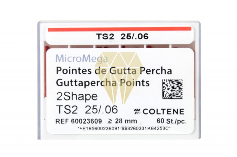 Puntas de Gutapercha diseñadas para obturar conductos radiculares preparados, utilizando el sistema 2Shape TS2. En conicidad del 6%, ISO 25. 60u