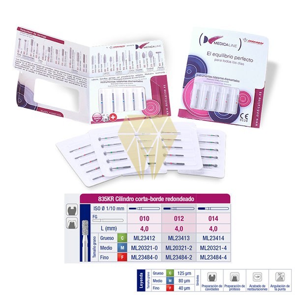 FRESA DE DIAMANTE FG PARA TURBINA CON FORMA DE CILINDRO CORTO CON BORDE REDONDEADO DE DIAMETRO 014 Y TAMAÑO DE GRANO GRUESO (COLOR VERDE).