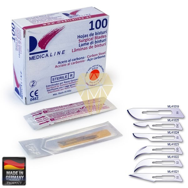 Hojas estériles de bisturí fabricadas en acero al carbono quirúrgico. Esterilizadas con rayos gamma. Caja de 100 unidades iguales envasadas y esterilizadas individualmente.