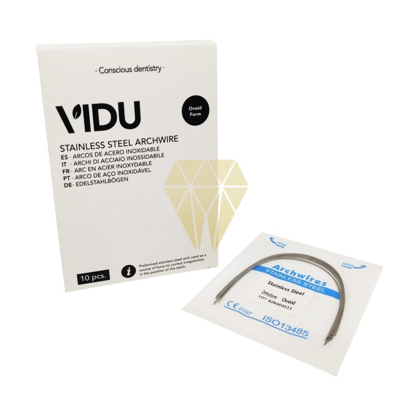 Los Arcos de Acero Inoxidable VIDU están fabricados con el sistema High Polish de pulido especial para reducir la fricción y mejorar el deslizamiento en la ranura del bracket (slot). Los Arcos de Acero Inoxidable VIDU vienen en forma Natural y Ovoide en todas las medidas superior e inferior.
