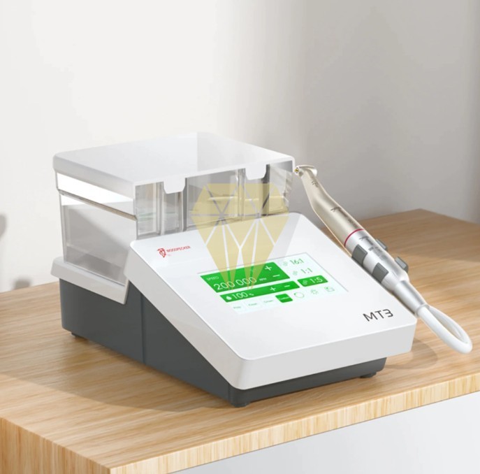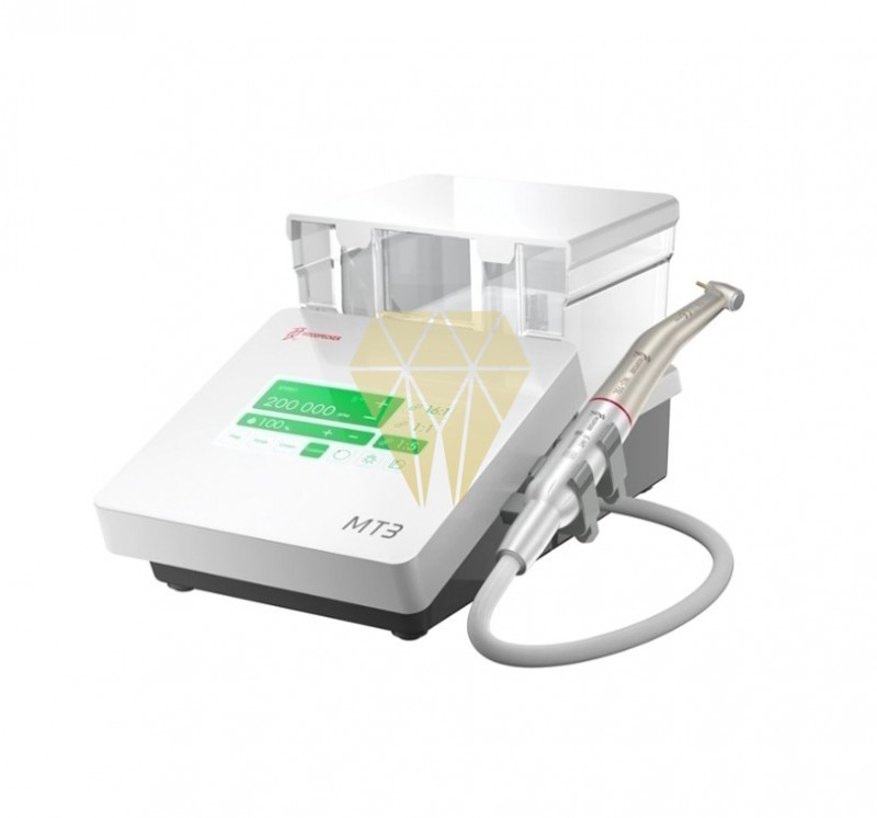 El MT3 es un micromotor eléctrico de sobremesa fabricado por Woodpecker®. Dispone de control digital de velocidad, pantalla táctil en la unidad y depósito de agua, ideal cuando no es posible conectar al suministro de red.