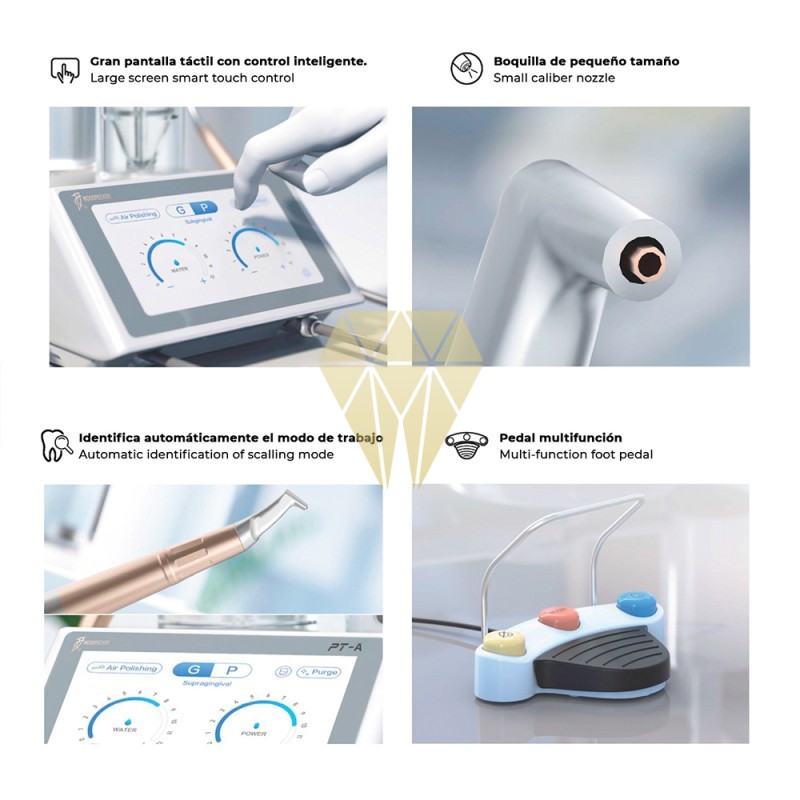 Potente y versátil aeropulidor 2 EN 1: Función Supragingival y Función Subgingival diseñado para eliminar Biofilm y manchas superficiales, incluso en las zonas de más difícil acceso.