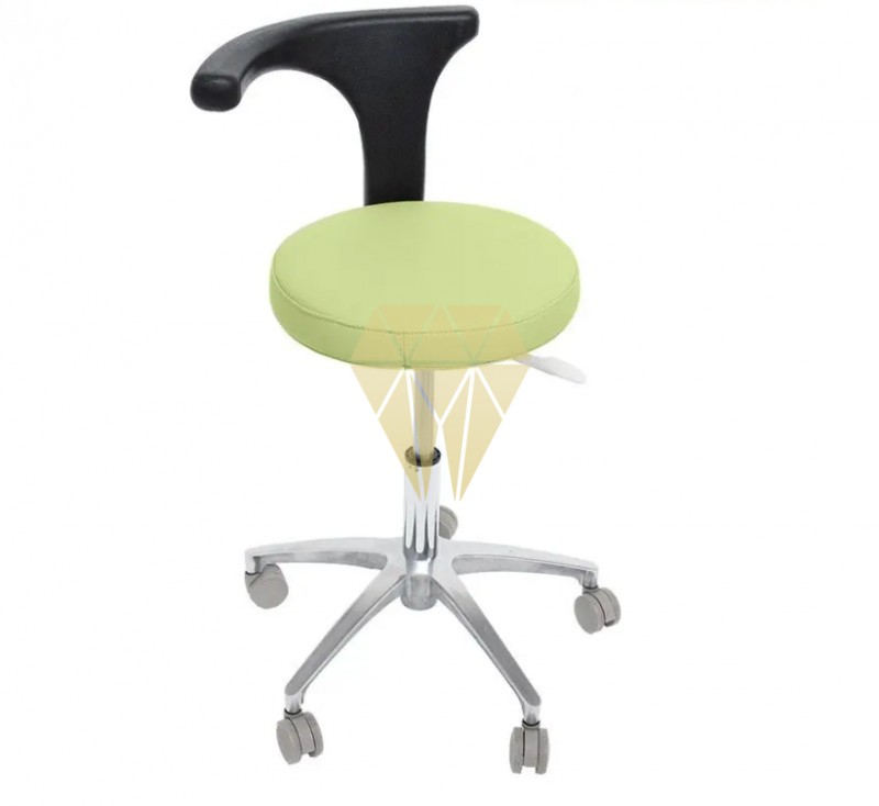 Es un taburete con borde curvo que reduce la presión sobre las piernas y permite una mejor circulación. La altura es ajustable ayudando al profesional a mantener una postura correcta. La superficie no tiene costuras por lo que facilita la limpieza. Su tapizado es tricapa, compuesto de: microfibra, cojín de espuma flex confort y marco soporte.