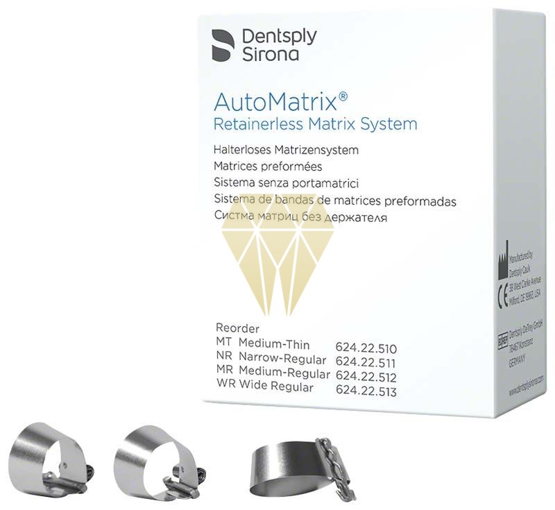 Sistema de bandas de matrices preformadas y contorneadas para marcar más fácilmente el cuello gingival. Recomendado en trabajos de clase I y II. Hay 4 tipos de bandas Automatrix en las que únicamente varía su diámetro y altura (MT, MR, NR, WR), por lo que se adaptan a cualquier diente. Contiene 72 bandas tipo Medium-Regular.