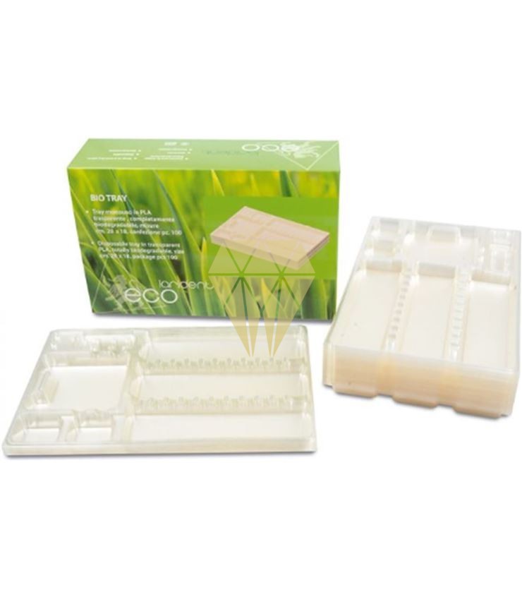 Bandeja desechable en PLA o ácido poliláctico, un polímero de origen vegetal (derivado del almidón de maíz) totalmente biodegradable: 90% en 60 días y completamente en 90 días.
