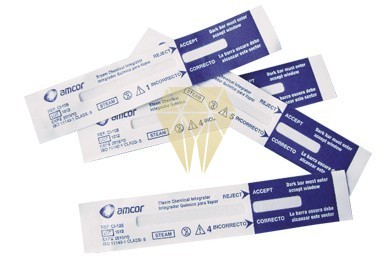 Indicador químico para vapor. Destinados a ofrecer información al usuario de como se ha desarrollado el proceso de esterilización, de acuerdo con su clasificación. Desde la aparición de la norma UNE-EN ISO 11140-1 los indicadores químicos para esterilización se encuadran, de acuerdo con su tolerancia, en diferentes Clases siendo las 4 y 5 las más exigentes para con los requisitos de funcionamiento y márgenes de variación respecto de lo declarado.