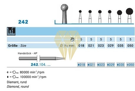 242.104.021 diamanteclinica cirugia ISO: 103 - Revolución Máxima: 100000 rpm - Forma: BOLA Diametro 021 - Mandril PIEZA DE MANO ESTANDAR Tipo de Grano: ESTANDAR - Aplicación: Elevacion De Seno - Cantidad Embalaje: 5 ud