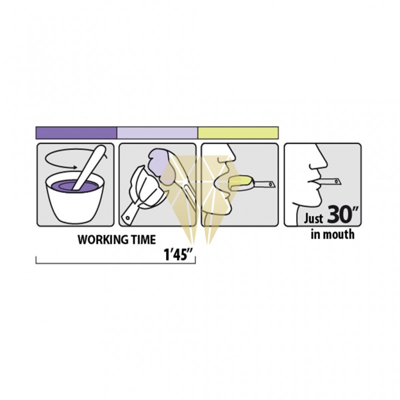 - Las indicaciones cromáticas de fase aseguran que el alginato sea perfectamente mezclado y que la introducción en la boca sea hecha en el momento justo.