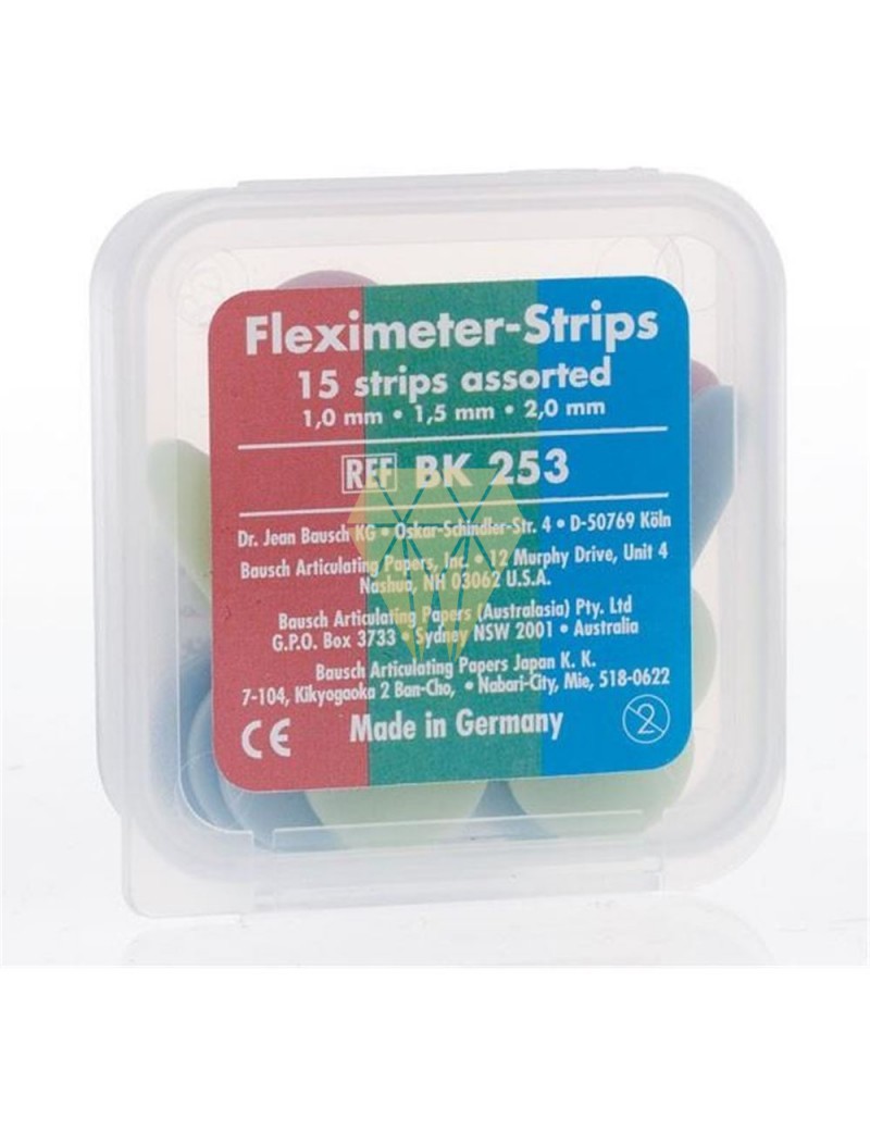 Las Fleximeter-Strips son calibres flexibles de tres espesores diferentes para medir la altura de la preparación mientras se liman los dientes para la reconstrucción. Un total de 15 piezas en distintos colores y grosores.